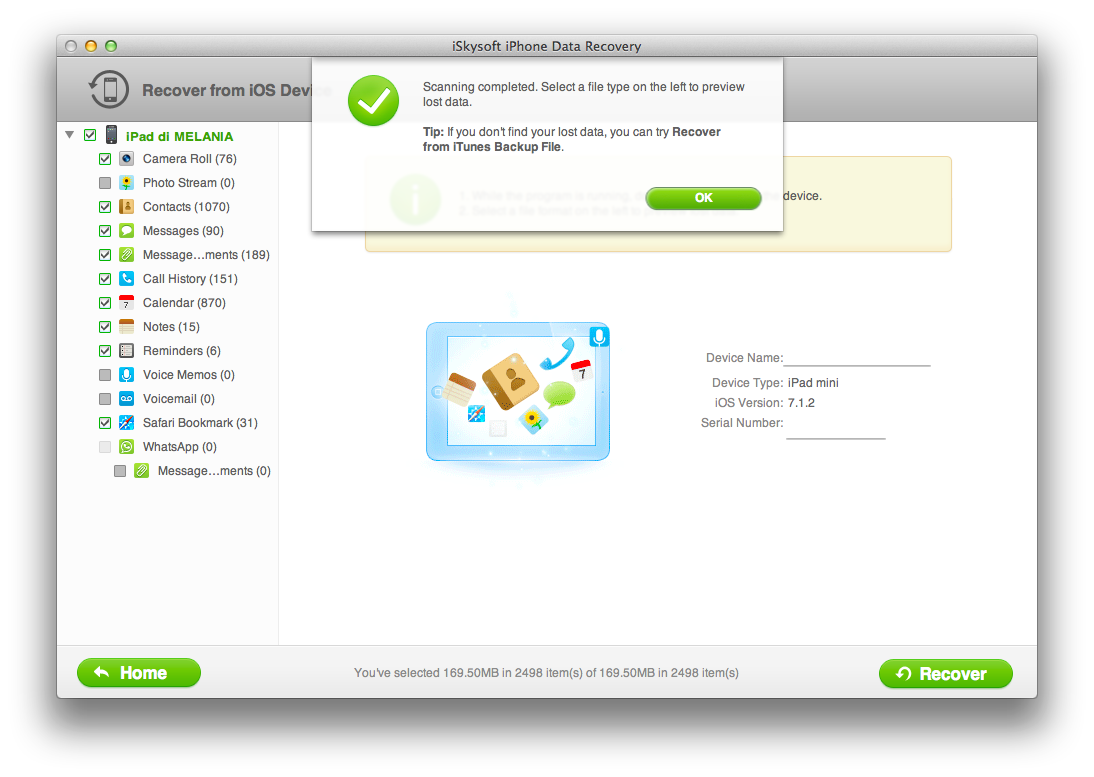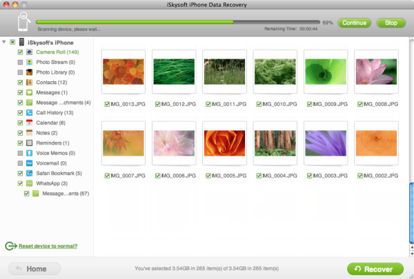 Il funzionamento di iSkysoft iPhone Data Recovery è davvero immediato, semplice ed intuitivo, adatto a qualsiasi tipologia di utente e non richiede alcuna conoscenza specifica di programmazione. Saranno sufficienti davvero pochi minuti e pochi click per recuperare, contatti, messaggi, fotografie, allegati SMS, cronologia Whatsapp, promemoria e appuntamenti calendario, cronologia Safari, memo vocali ed altri dati ancora. La schermata principale dell’applicazione chiederà, anzitutto, la fonte del recupero dei dati: dispositivo iOS o iTunes. Nel primo caso è ovviamente necessario collegare iPhone, iPad o iPod Touch al Mac. Dopo aver collegato il device l’applicativo inizierà automaticamente una scansione dell’intero contenuto, richiedendo mediamente 10 minuti per completare l’intero procedimento. In modo del tutto simile a Dr. Fone, anche in questo iSkysoft iPhone Data Recovery sarà presente un pratico menù sulla parte sinistra, attraverso il quale sfogliare i file recuperati. Questo sistema risulta particolarmente pratico, veloce e ordinato. Selezionando le diverse voci, come contatti, messaggi o foto, sarà possibile visionare in anteprima il contenuto recuperato, così da visualizzare i dati di proprio interesse ancor prima di procedere al loro salvataggio. Così, è possibile selezionare soltanto determinati file, in modo da velocizzare il procedimento di salvataggio ed escludere file non necessari.
