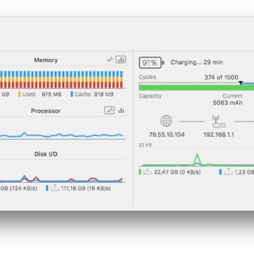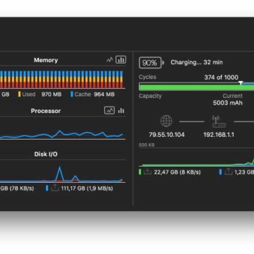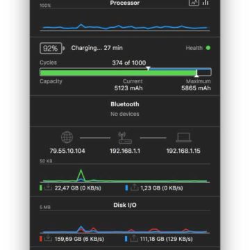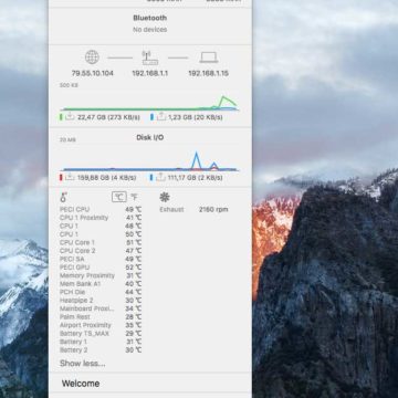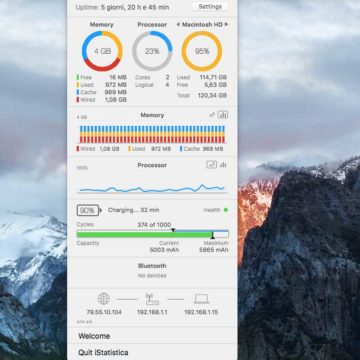 Comode le voci per visualizzare al volo: indirizzo IP che identifica l’host collegato alla rete, quello pubblico e quello del router/access point Wi-Fi al quale è collegato il computer. Sui notebook è visualizzata la percentuale di carica della batteria e la capacità di carica espressa in mAh. Non manca la possibilità di visualizzare dettagli su eventuali dispositivi Bluetooth collegati. Dalla sezione Settings (Impostazioni) è possibile scegliere i parametri da visualizzare/nascondere, attivando quelli di nostro interesse con semplici pulsanti. Da questa sezione è anche possibile impostare il caricamento dell’app automaticamente all’avvio del Mac.