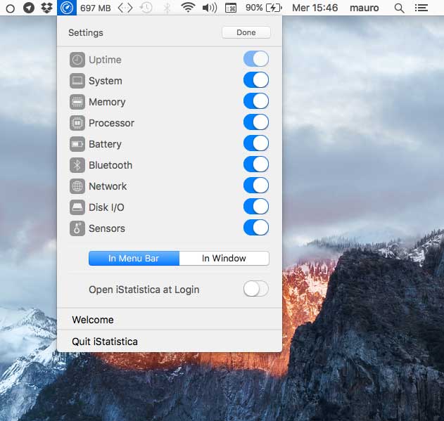 Oltre che dalla finestra richiamabile dalla barra dei menu, è possibile visualizzare i vari parametri di riferimento nel Notification Center o in una finestra dedicata. Lo sviluppatore permette di scegliere per l’applicazione sia un tema chiaro, sia un tema scuro.