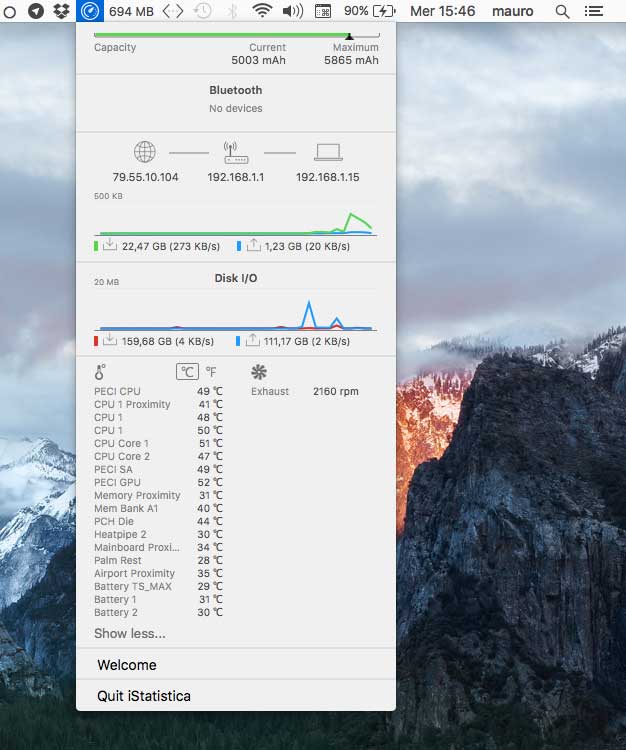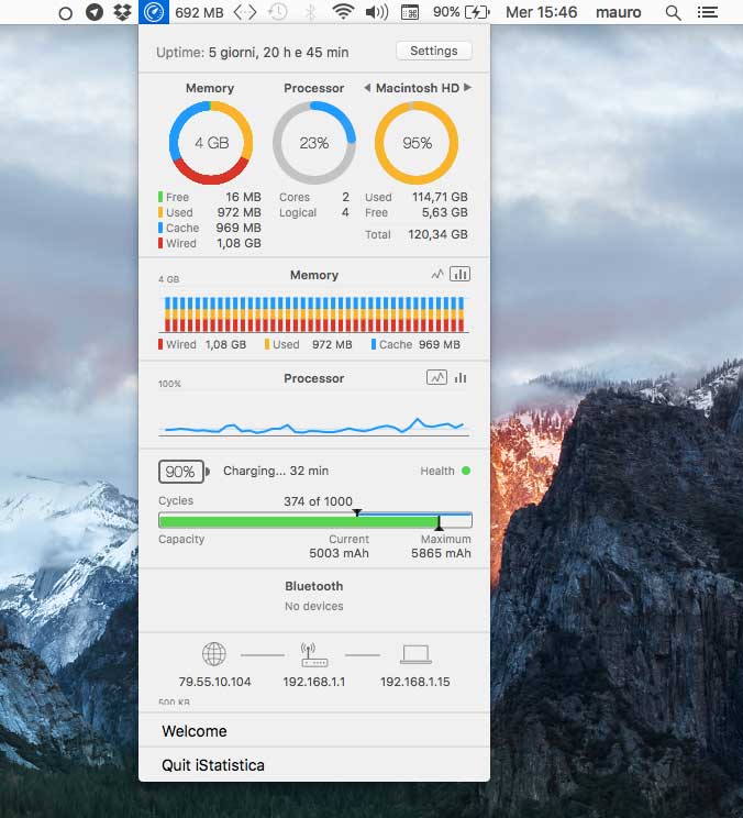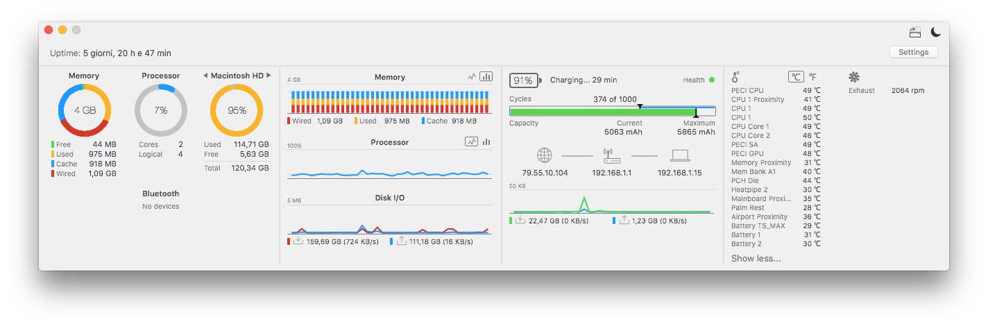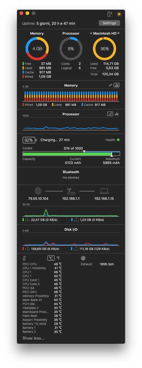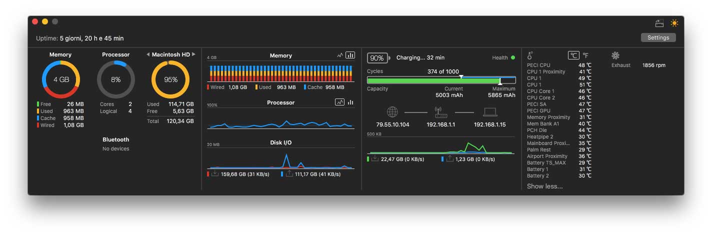 Comode le voci per visualizzare al volo: indirizzo IP che identifica l’host collegato alla rete, quello pubblico e quello del router/access point Wi-Fi al quale è collegato il computer. Sui notebook è visualizzata la percentuale di carica della batteria e la capacità di carica espressa in mAh. Non manca la possibilità di visualizzare dettagli su eventuali dispositivi Bluetooth collegati. Dalla sezione Settings (Impostazioni) è possibile scegliere i parametri da visualizzare/nascondere, attivando quelli di nostro interesse con semplici pulsanti. Da questa sezione è anche possibile impostare il caricamento dell’app automaticamente all’avvio del Mac.