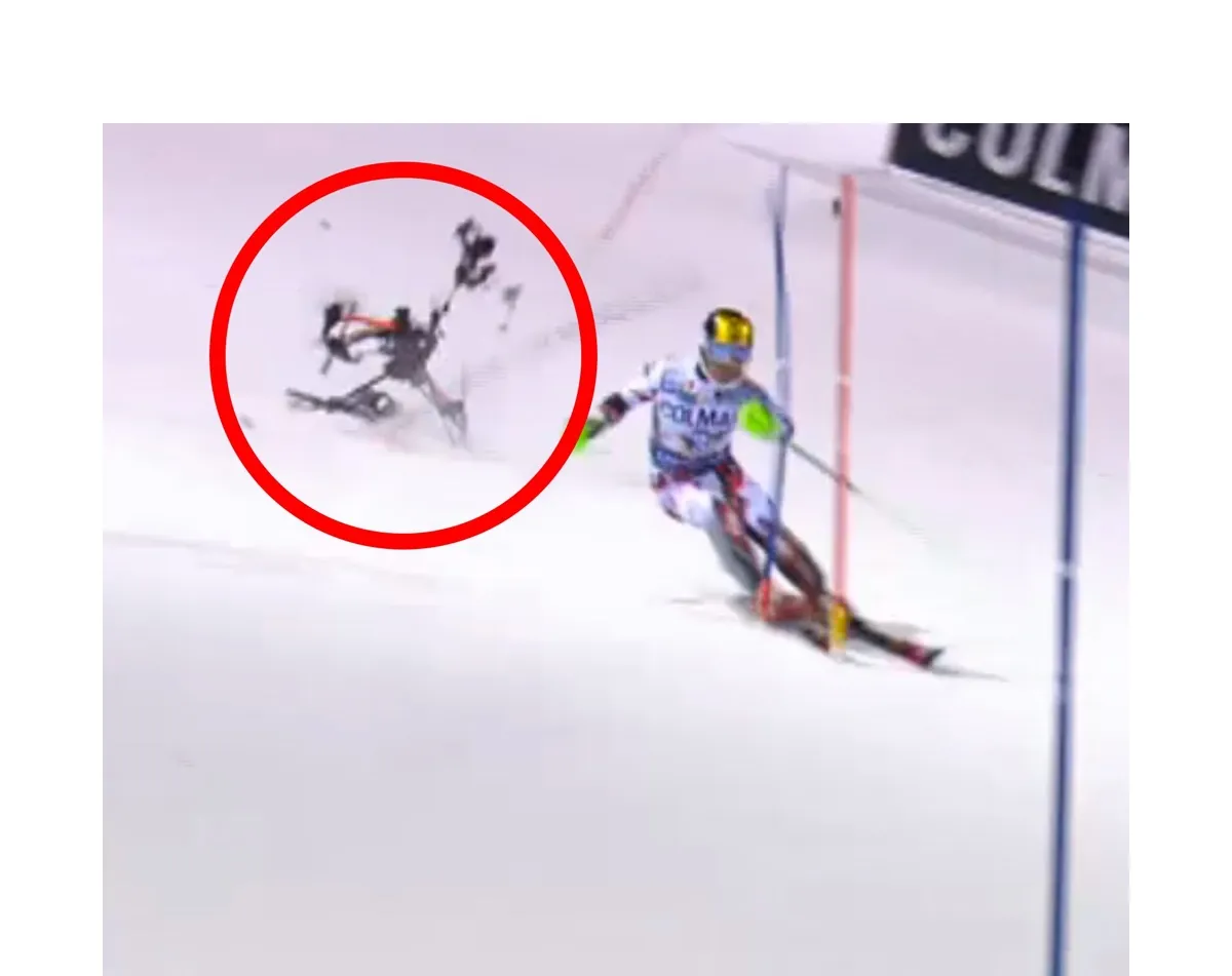 Mentre l’atleta austriaco Marcel Hirscher sta effettuando la sua discesa lottando per la prima posizione, un drone riprende la gara sorvolando alle sue spalle. Improvvisamente il drone precipita: si tratta di un velivolo di una emittente televisiva a cui è applicata una pesante videocamera professionale. È una questione di istanti: per un soffio il drone precipita sulla pista mancando per miracolo l’atleta.