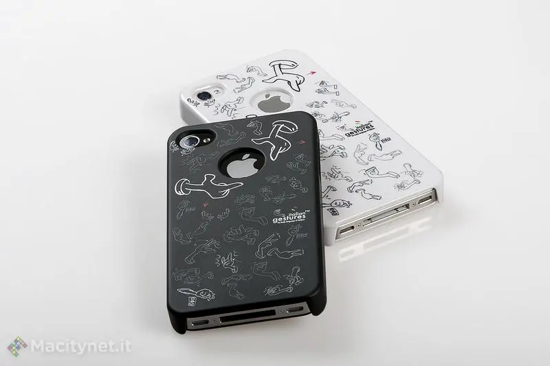Dal semplice saluto, all’interrogazione, dalle dita incrociate fino agli sfotto’: le cover sono decorate con decine delle gesture italiane più famose, inclusa la geniale evidenziazione del logo Apple. Un foro nella cover lascia intravvedere la Mela morsicata: a destra e sinistra il fumetto di due mani disegnate con pollici e indice spalancati, nel tipico gesto da sempre impiegato per indicare le dimensioni di un oggetto o la rilevanza di una argomentazione, mettono ancora più in risalto il marchio Apple.