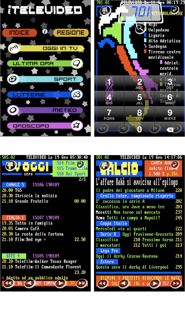 Fa un certo effetto osservare le schermate del programma iTeleVideo di Matteo Gobbi riprese mentre funziona su iPhone e iPod touch: sugli schermi dei tascabili della Mela appare infatti l’inconfondibile e storica grafica a cubettoni del servizio Televideo della RAI. Come sulla televisione del salotto o quella della cucina ora, grazie a iTeleVideo, possiamo consultare le ultime notizie, i risultati delle partite, estrazioni della lotteria, la programmazione completa delle reti nazionali e private, infine meteo, oroscopo e tutto quanto siamo abituati a consultare da anni dal televisore grazie al Televideo.