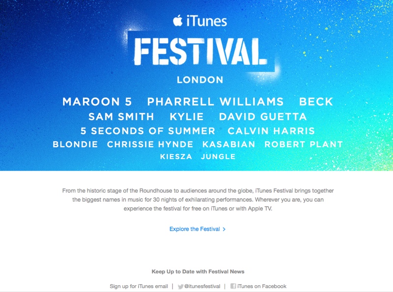 Apple annuncia l’ottava edizione di iTunes Festival: per tutto il mese di settembre numerosi tra i più importanti artisti in campo musicale si esibiranno dal vivo dal leggendario Roundhouse di Londra. Quest’anno sono già state annunciate le performance di Maroon 5, Pharrell Williams, Beck, Sam Smith, Blondie, Kylie, David Guetta, 5 Seconds of Summer, Calvin Harris, Chrissie Hynde, molti altri artisti e band saranno comunicati nei prossimi giorni.