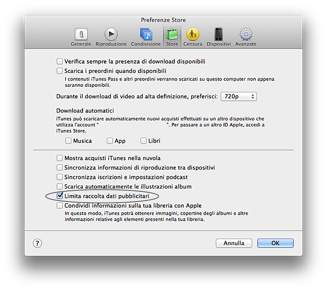 Una funzione passata un po’ in sottotono con gli ultimi aggiornamenti di iTunes è una nuova opzione comparsa nelle Preferenze del programma: “Limita raccolta dati pubblicitari” (si trova nella sezione “Store” delle Preferenze). Questa opzione riguarda gli annunci mirati iAd ed è la stessa disponibile sui dispositivi iOS (si trova in Impostazioni > Privacy > Pubblicità) e sulla Apple TV (Impostazioni > iTunes Store).