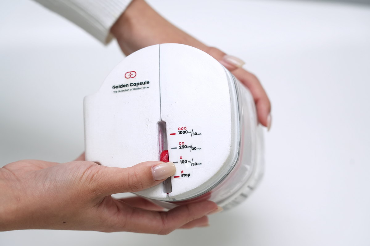 In risposta a questo problema, un team di studenti inventori della Hongik University di Seul ha progettato Golden Capsule, un dispositivo per flebo non alimentato, che non richiede l’uso delle mani e che sfrutta le forze elastiche e le differenze di pressione dell’aria anziché la gravità. Ciò significa che i medici delle zone disastrate non devono tenere in mano le confezioni di flebo durante il trasporto dei pazienti e non è necessaria l’elettricità per controllare la velocità di infusione.