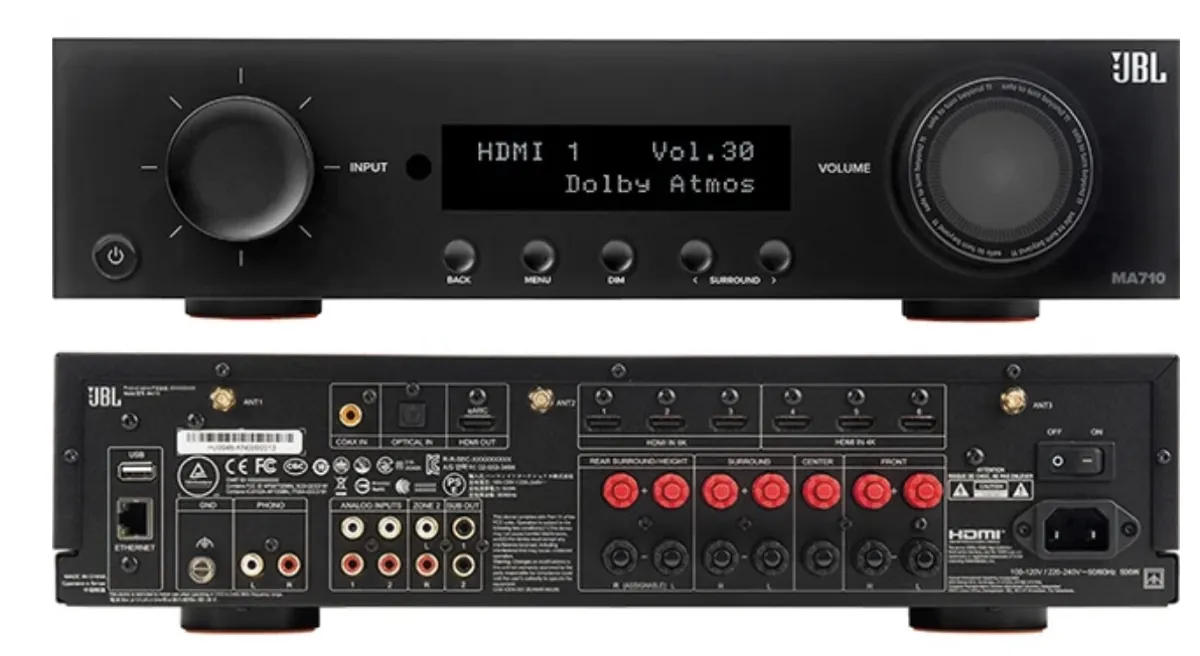 JBL MA710 si distingue con 7.2 canali e una potenza di 110Wx7, compatibilità con Atmos/DTS:X, Bluetooth APTX HD, supporto per una seconda zona e bi-amplificazione.