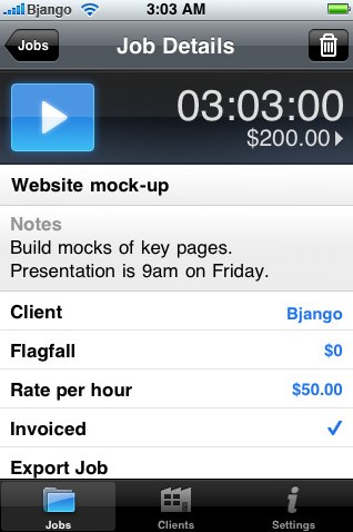Jobs – Time Tracker consente di creare una tabella di marcia e di iniziare a tracciare la propria attività , singolarmente o in contemporanea con altri task. L’elenco può poi essere esportato in formato csv o inviato in formato testo via email.