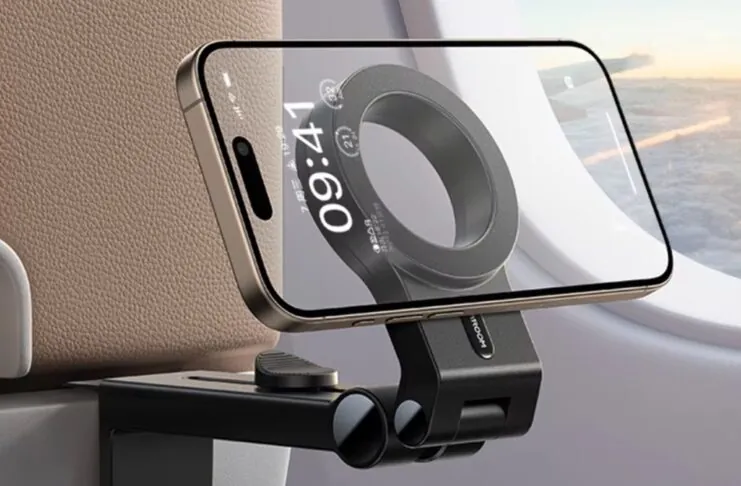 Presenta un anello magnetico attraverso cui agganciare gli iPhone con MagSafe o tutti gli altri smartphone compatibili mentre all’altro capo della struttura c’è un morsetto a molla che permette di fissarlo a schienali di aerei, tavolini, maniglie delle valigie, scrivanie e altro ancora.