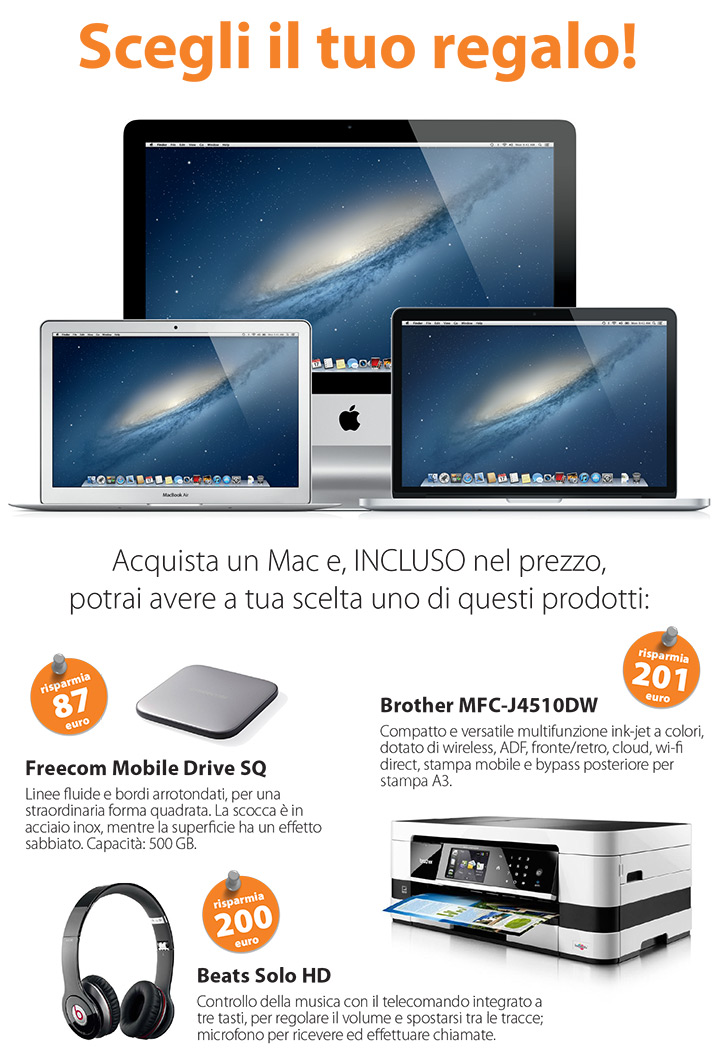 Solo questo weekend nei negozi della catena Juice [sponsor] Apple Premium Reseller è possibile acquistare un nuovo Mac e scegliere il tuo regalo tra i 3 disponibili, con un risparmio che può arrivare fino a 201 euro. E’ possibile scegliere come regalo tra: il disco fisso portatile Freecom Mobile Drive SQ con capacità di 500GB, la stampante multifunzione Brother MFC-J4510DW oppure le cuffie Beats Solo HD.