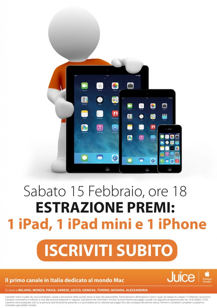 Nel corso della giornata di inaugurazione, a sorpresa, verranno distribuiti sacchetti con gadget ai più fortunati. Ricordiamo che fino a sabato 15 febbraio alle ore 18 è possibile registrarsi gratuitamente per partecipare all’estrazione dei regali: un iPad, un iPad mini e anche un iPhone. Per partecipare non occorre acquistare nulla: basta recarsi in negozio e lasciare nome, cognome e indirizzo mail agli addetti dello store Juice. Tutti i nomi verranno memorizzati in un Mac e dalle ore 18 un software sorteggerà i vincitori in modo casuale. I premi verranno assegnati sabato 15 febbraio solo se la persona estratta sarà fisicamente presente in negozio, in caso contrario si procederà con un ulteriore sorteggio.