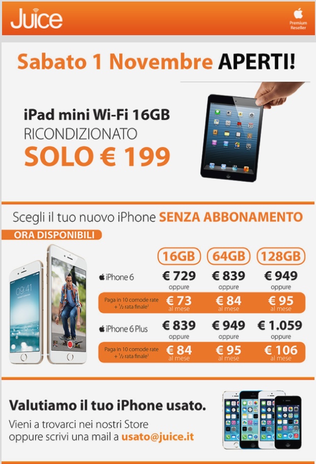 Per esempio iPhone 6 16 GB da 729 euro si ottiene pagando 73 euro al mese per 10 mesi più l’ultima rata da 36,5 euro, per un costo totale di 766,50 euro. iPhone 6 Plus da 16 GB costa 839 euro: si ottiene pagando 84 euro al mese per 10 mesi più la mezza rata finale di 42 euro, per un totale di 882 euro. Lo stesso vale per gli altri modelli con capacità di memoria superiori da 64 GB e 128 GB. Ricordiamo che i negozi Juice valutano e ritirano gli iPhone usati: per informazioni è possibile visitare uno dei punti vendita Juice oppure scrivere a [email protected].
