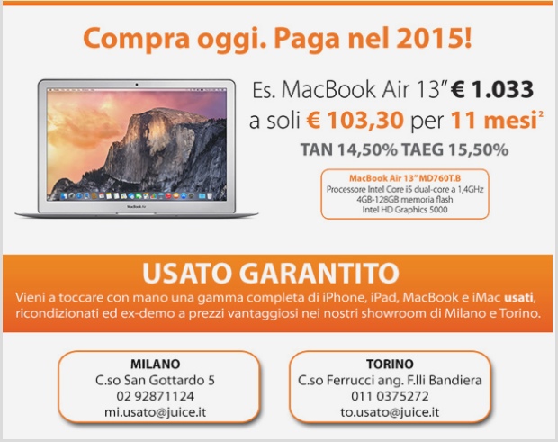 Infine segnaliamo il lancio del nuovo finanziamento per l’acquisto di un nuovo Mac: il computer si ottiene subito ma il pagamento inizia nel 2015. Si tratta di un finanziamento con TAN 15,50% e TAEG 15,50%: per esempio MacBook Air 13” da 1.033 euro si compra pagando 11 rate da 103,30 euro.