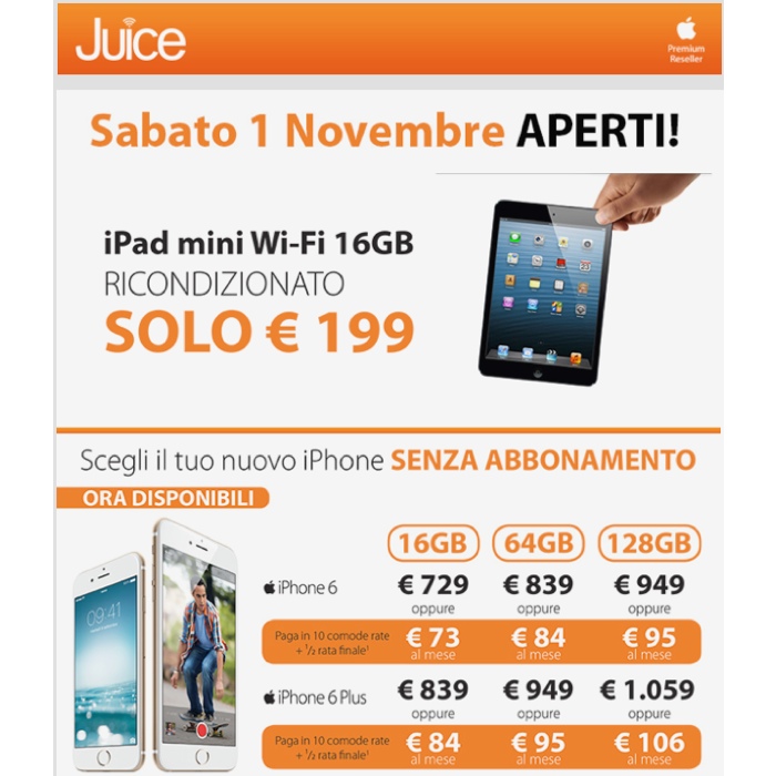 L’appuntamento settimanale con le promozioni Juice è particolarmente ricco, sia per le offerte sui dispositivi usati e ricondizionati, sia sui prodotti Apple di ultima generazione: ricordiamo che tutti gli store Juice saranno aperti anche domani sabato primo novembre. Per chi è alla ricerca di iPad ad un prezzo abbordabile, Juice propone iPad mini 16 GB ricondizionato di prima generazione a solo 199 euro, uno dei prezzi più bassi in assoluto sul mercato, inferiore anche ai ricondizionati di Apple Store online. Si tratta di modelli privi di schermo Retina ma con prestazioni e specifiche ancora perfetti per utilizzare tutte le numerose app, giochi e utility disponibili su App Store per il tablet della Mela.