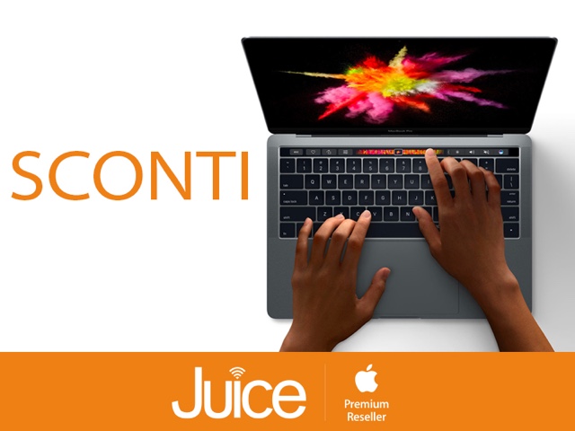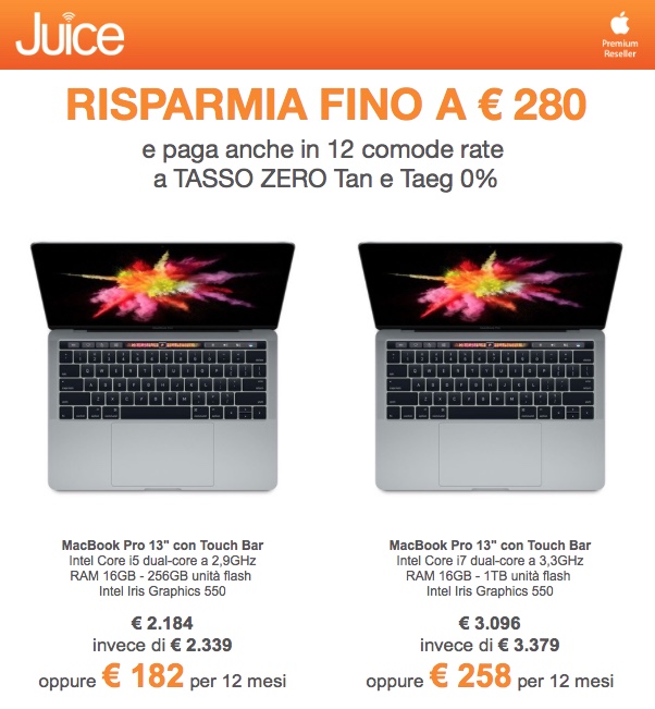 Nei negozi Juice i MacBook Pro con Touch Bar, introdotti a fine 2016, si comprano con risparmi fino a 280 euro con in più la possibilità di pagare con Tasso Zero in 12 mesi. La doppia promozione permette così di acquistare un portatile Mac di penultima generazione, appena sostituito nel listino Apple, ma che ha una anzianità ridottissima.