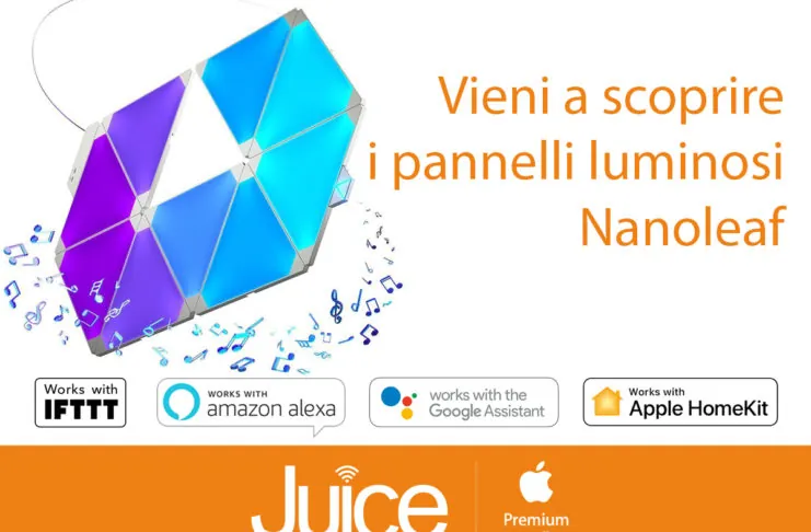 Da Juice disponibili Nanoleaf, i pannelli smart per illuminare e arredare casaI pannelli luminosi Nanoleaf sono smart, si controllano a distanza e sono compatibili con tutti i principali dispositivi e piattaforme di domotica. Si possono infatti controllare tramite Amazon Alexa, Assistente Google e sono già pronti per funzionare con Apple HomeKit, l’app Casa di Apple e anche con i comandi vocali di Siri.