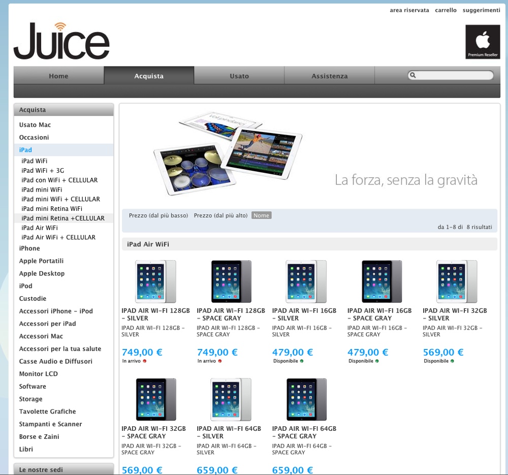 Il nuovo iPad Air arriva domani ma fin d’ora grazie al sito web Juice è possibile valutare con più precisione il modello e la capacità più indicati per le proprie esigenze, infine selezionare il punto vendita in cui la configurazione desiderata risulta maggiormente disponibile.
