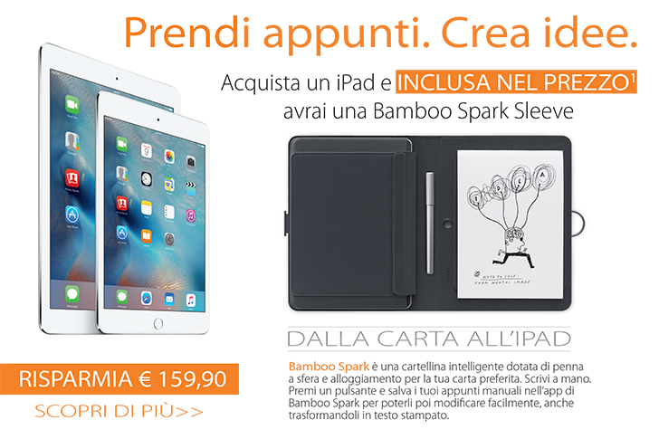 Nei negozi Juice sono disponibili numerose promozioni dedicate agli appassionati Apple e non solo. A chi acquista un nuovo iPad Juice regala Bamboo Spark Sleeve, la custodia smart ed elegante che permette di scrivere su carta e digitalizza al volo appunti scritti, note così come bozze, disegni e qualsiasi altra idea o progetto.
