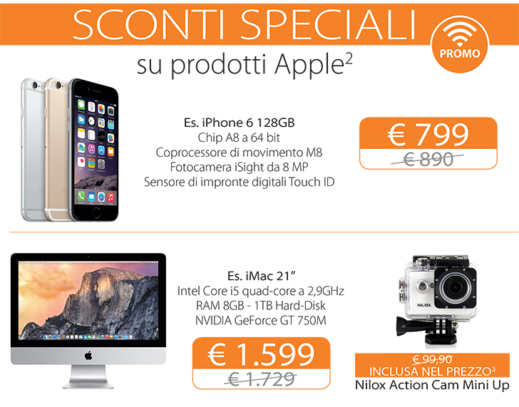 Sempre nei negozi Juice sono disponibili diversi prodotti Apple e anche di altri marchi a prezzo scontato. Per esempio iPhone 6 128 GB è proposto a 799 euro invece di 890 euro, iPad mini 3 64 GB a 399 euro. Chi acquista iMac 21” fine serie a 1.599 euro invece di 1.729 euro, riceve in regalo Nilox Action Cam Mini Up del valore di 99,90 euro.