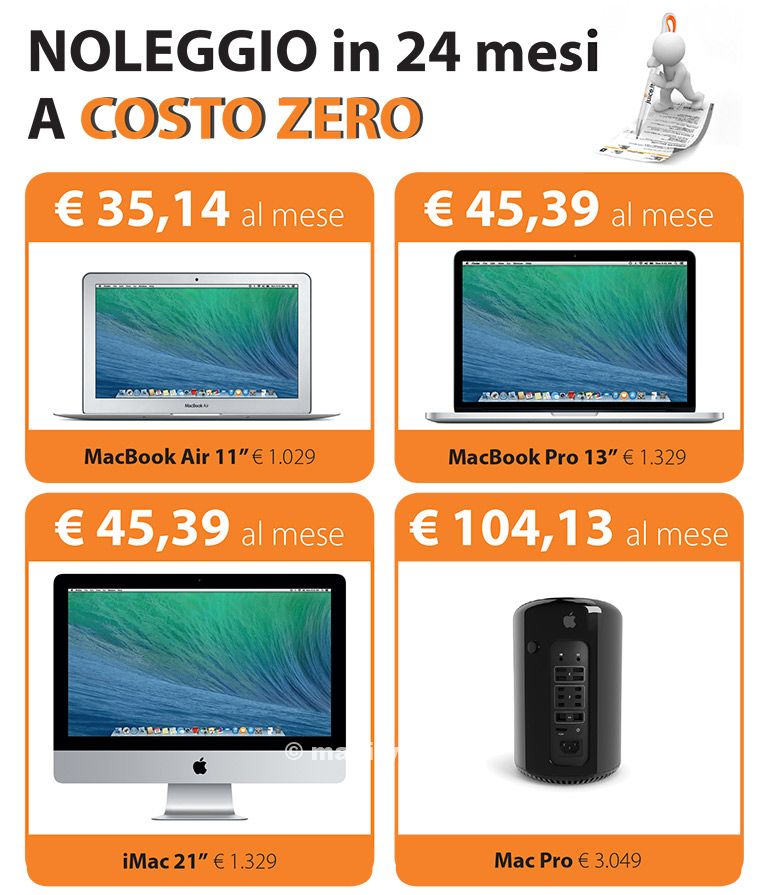 Invece professionisti (titolari di partita IVA da almeno tre anni) e aziende hanno a disposizione fino al 30 giugno il Noleggio a Costo Zero in 24 mesi: grazie a questa modalità non occorre sborsare grandi somme per poter acquistare subito un nuovo Mac: l’importo infatti viene suddiviso in piccole rate mensili, con pagamento trimestrale, che risultano in contabilità come spese operative, quindi in riduzione al reddito (e all’IVA) per tutti i 24 mesi della durata del Noleggio a Costo Zero. Questa soluzione permette inoltre di ammortizzare i computer e i dispositivi Apple in un periodo inferiore rispetto al tradizionale acquisto. Ricordiamo che il Noleggio a Costo Zero prevede canoni fissi e variabili e può essere concesso, previa approvazione di GE Capital Services, per un importo minimo di 500 euro e per l’importo massimo di 100mila euro, in entrambi i casi IVA esclusa.