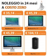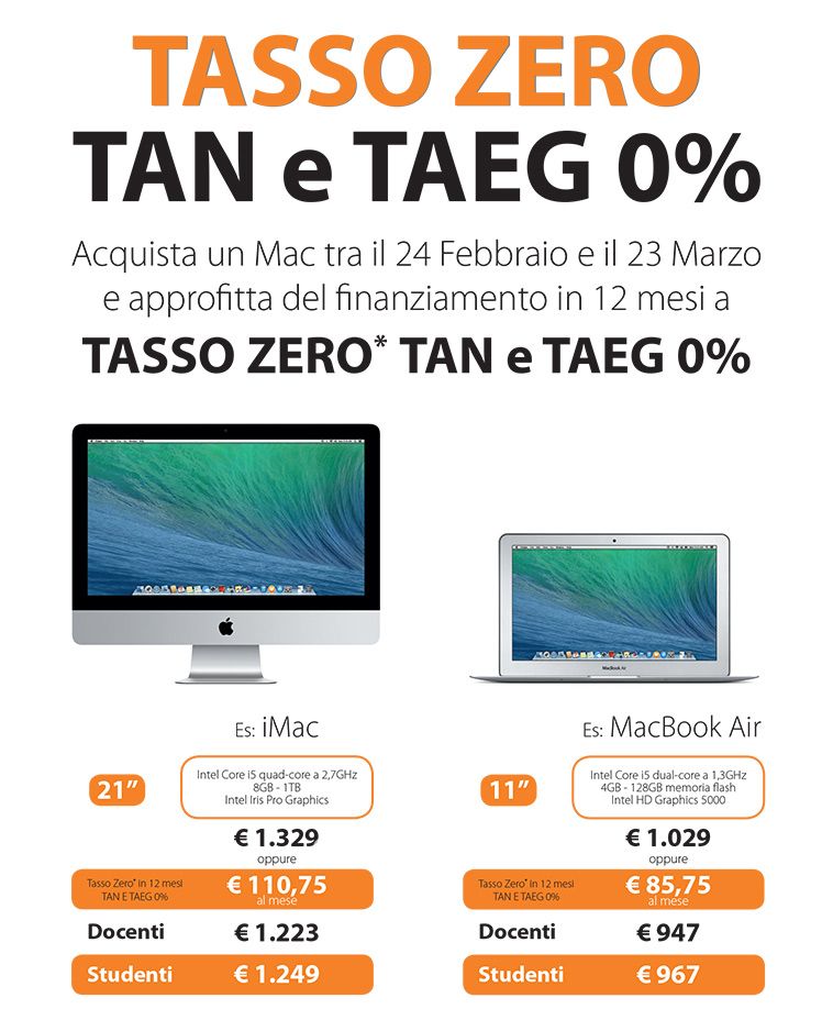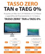 Ricordiamo che fino al 23 marzo è possibile acquistare un nuovo computer Mac, desktop o portatile, pagando in 12 mesi con Tasso Zero. Si tratta di un finanziamento a Tasso Zero reale, con TAN 0% e TAEG 0%, senza alcun costo per il cliente, nemmeno per le spese di gestione pratica. Così chi acquista un iMac 21,5” a listino a 1.329 euro paga 110,75 euro al mese per 12 mesi; ancora MacBook Air 11” da 1.29 euro paga 85,75 euro al mese per 12 mesi.