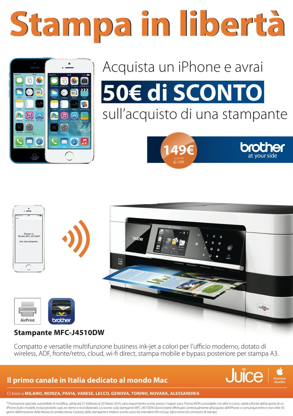 Fino al 20 marzo chi acquista iPhone nei negozi della catena Juice ottiene uno sconto di 50 euro per l’acquisto di una stampante multifunzione Brother MFC-J4510DW. Si tratta di un dispositivo 4 in 1 versatile e completo che funziona come stampante a getto d’inchiostro a colori, scanner, fotocopiatrice e anche come fax. Oltre alla porta USB è dotata di connettività wireless, inoltre è compatibile con la tecnologia Air Print di Apple, così è possibile stampare direttamente inviando documenti da iPhone, iPad, Mac sfruttando la rete Wi-Fi di casa o dell’ufficio. Grazie al Wi-Fi è compatibile anche la stampa dal cloud per Google Docs, Evernote, Dropbox, Facebook, Flickr e anche Picasa.