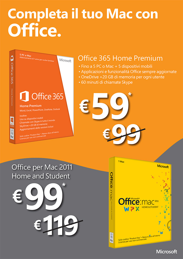 Chi acquista un Mac nei negozi Juice può acquistare a prezzo super scontato anche Microsoft Office per Mac. La suite di produttività online Office 365 Home Premium è proposta a solo 59 euro invece del prezzo di listino di 99 euro. Ricordiamo che Office 365 Home Premium può essere utilizzato fino a 5 Mac o PC oltre a 5 dispositivi mobile, iPhone e iPad inclusi. Questa versione include tutte le funzionalità di Office, sempre aggiornate grazie al funzionamento via cloud, un accout OneDrive +20 GB di storage cloud per ogni utenti e anche 60 minuti di chiamate telefoniche con Skype.
