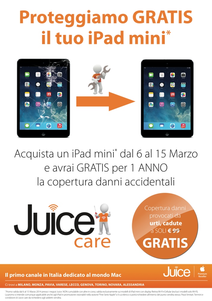 La nuova promozione Proteggiamo Gratis il tuo iPad mini è valida fino al 15 marzo: con la copertura danni accidentali per 1 anno chi acquista iPad mini Retina Wi-Fi + cellular è così protetto con la garanzia standard di due anni sul nuovo prodotto contro difetti e malfunzionamenti, inoltre il dispositivo è assicurato anche contro danni provocati accidentalmente da urti e cadute. Si tratta di una assicurazione aggiuntiva del valore di 99 euro regalata da Juice. Notiamo che questa promozione non include gli iPad mini Retina solo Wi-Fi, in ogni caso può essere estesa anche agli iPad disponibili nella sezione Fine Serie di Juice: l’elenco può essere richiesto all’interno del punto vendita.