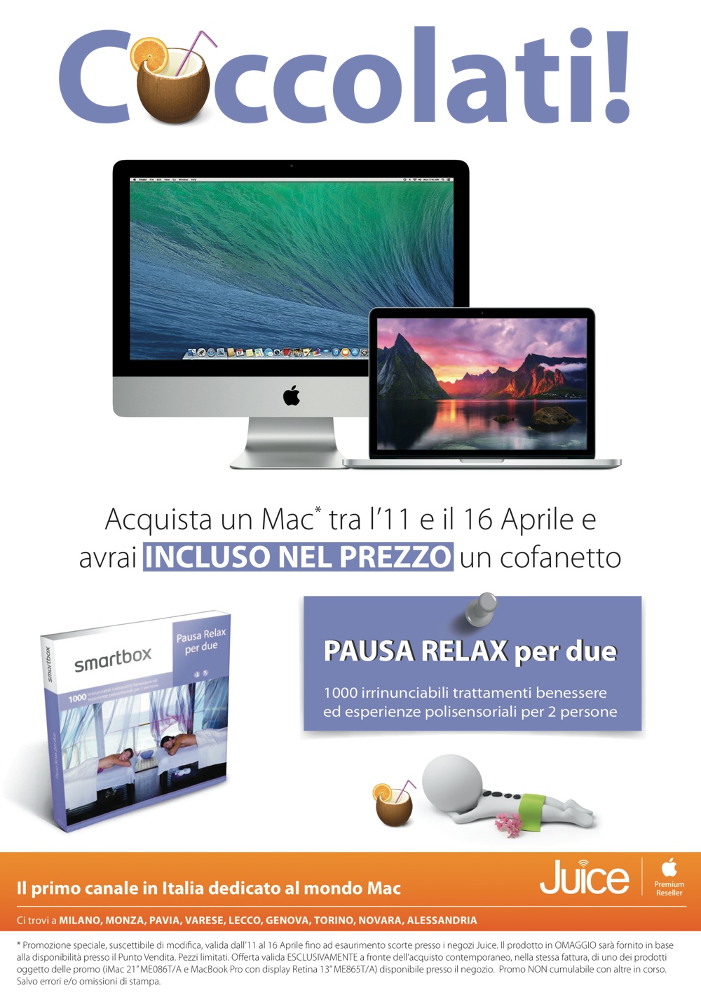Gli utenti che acquistano iMac 21” o MacBook Pro 13” Retina ricevono in regalo Smartbox Pausa Relax per due, il cofanetto che permette di scegliere tra 1.000 trattamenti di benessere per due persone disponibili in tutta Italia. Questa promozione è valida fino al 16 aprile con l’acquisto di iMac 21” (ME086T.A) oppure di un MacBook Pro con display Retina 13” (ME865T.A).