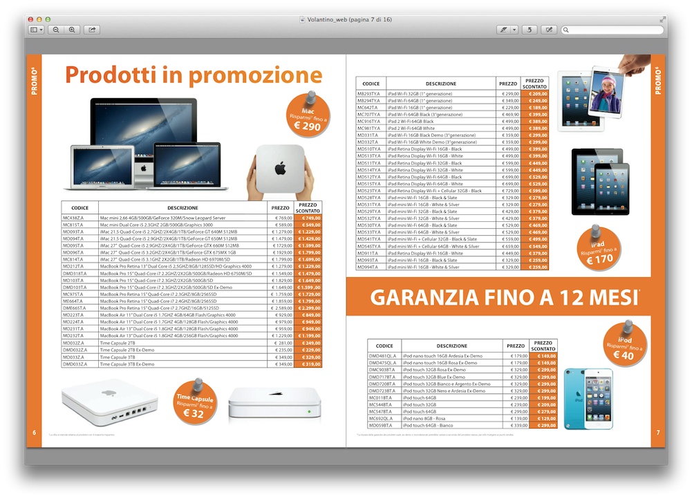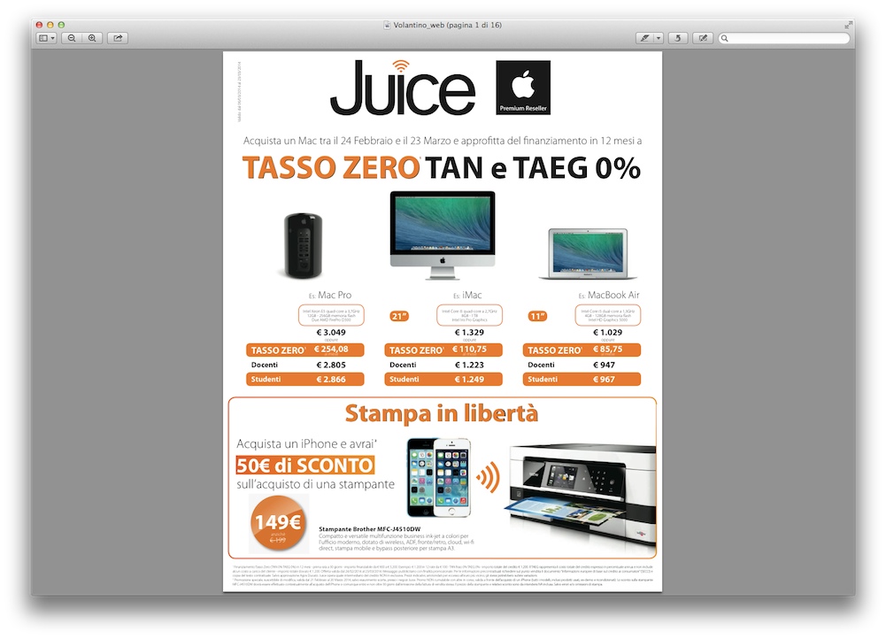 Oltre al Tasso Zero con TAN 0% e TAEG 0% per pagare un nuovo Mac in 12 piccole rate per i privati, ricordiamo la disponibilità del noleggio operativo a costo zero per le aziende e i professionisti con Partita IVA da almeno 3 anni. Sempre nel volantino Juice troviamo l’elenco completo di tutti i computer Apple in promozione, un’ottima occasione per acquistare un modello fine serie di penultima generazione risparmiando fino a 290 euro sul prezzo originale di listino. Ecco alcuni esempi: Mac mini con processore da 2,66 GHz, disco fisso da 500GB e scheda video integrata GeForce 320M a 749 euro invece di 769 euro, iMac 21,5” con Intel Core i5 quad core da 2,7 GHz, 8 GB di memoria RAM, scheda video da 1 TB e GeForce GT 640M con 512 MB di RAM a 1.229 euro, MacBook Pro 15” Retina con processore Intel Core i7 quad core da 2,7 GHz, 16 GB di memoria RAM e unità SSD da 512 GB a 2.589 euro invece di 2.299 euro.