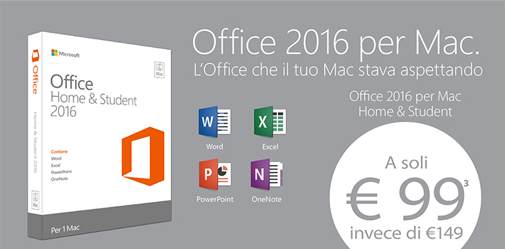 Per chi usa il Mac per lo studio e il lavoro, nei negozi Juice e anche sul sito web, è possibile acquistare Microsoft Office Home and Student 2016 scontato a 99 euro, un risparmio di 50 euro rispetto al prezzo di listino di 149 euro. Un’ottima occasione per ottenere la suite di produttività più diffusa e utilizzata al mondo per scrivere e gestire testi, fogli di calcolo, presentazioni e molto altro ancora.