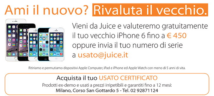 Infine ricordiamo che da sempre Juice effettua la valutazione dell’usato Apple per la permuta e l’acquisto di un dispositivo di ultima generazione. Oltre ai computer della Mela, Juice valuta e ritira anche iPhone e iPad: per esempio per iPhone 6 usato può valere fino a 450 euro. Per ottenere la valutazione gratuita del proprio usato Apple è possibile recarsi in un negozio della catena Juice oppure tramite email scrivendo all’indirizzo [email protected] inserendo il numero di serie.