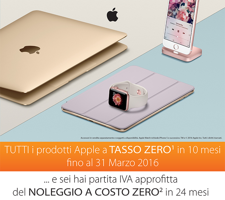 Per i privati qualsiasi prodotto Apple, incluso Apple Watch, può essere acquistato con Tasso Zero reale (TAN e TAEG pari a zero) suddividendo il pagamento in 10 rate mensili, senza alcuna spesa aggiuntiva per il cliente, né per interessi né per spese di pratica. Per esempio iPhone 6s 128 GB da 999 euro si paga in 10 rate da 99,90 euro al mese. MacBook Air 13” da 1.179 euro si paga in 10 mesi a 117,90 euro al mese per 10 mesi, iPad Pro 128 GB Wi-Fi + Cell da 1.249 euro si paga in 10 rate da 124,90 euro al mese. Anche Apple Watch si può indossare subito e pagare in 10 rate da 41,90 euro: l’unico prodotto escluso da questa promozione è Apple TV.