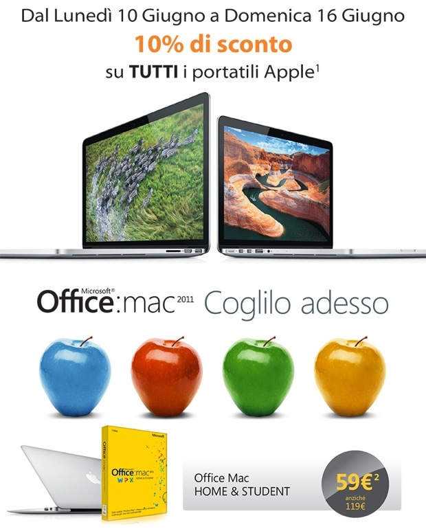 Ricordiamo che lo sconto del 10% vale solo sui prodotti già disponibili a magazzino nei negozi Juice. Chi acquista un nuovo portatile Apple, sia questo MacBook Air, MaBook Pro e MacBook Pro Retina, può acquistare in abbinamento anche Microsoft Office per Mac versione Home&Student con un consistente sconto: invece di 199 euro a solo 59 euro.