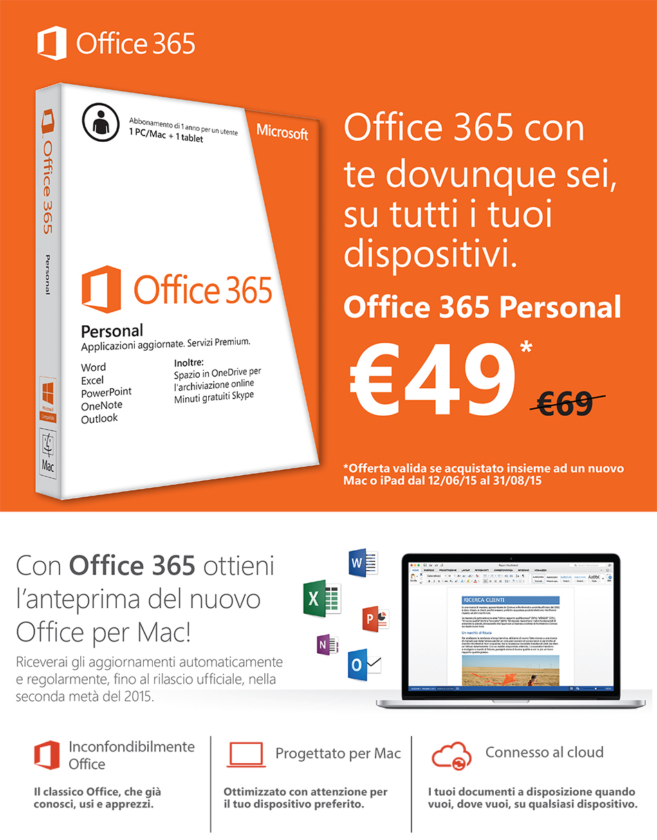 Così iPhone 6 64 GB da 839 euro si paga in 10 rate da 83,90 euro al mese, iPad Air 2 da 619 euro pagando 61,90 euro per 10 mesi oppure MacBook Air 13” da 1.179 euro a solo 117,90 euro al mese, così come iMac 21,5” da 1.279 euro pagandolo 127,90 euro per 10 mesi. Ricordiamo che chi acquista un iPad o un computer Mac può ottenere Microsoft Office 365 Personal a prezzo scontato: invece di 69 euro per un anno a solo 49 euro per la suite di produttività cloud che può essere utilizzata su un Mac o un PC, ma anche su smartphone e tablet, ovviamente iPhone e iPad inclusi.