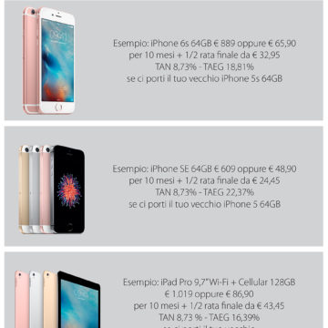 La promozione Tasso Zero Juice, con TAN e TAEG pari a zero, permette di suddividere il costo di un nuovo iPhone, iPad, Mac e anche Apple Watch in 10 piccole rate più abbordabili, senza costi aggiuntivi per il cliente. Tra le promozioni più interessanti segnaliamo lo sconto di 120 euro su MacBook 12” proposto da Juice a 1.709 euro invece di 1.829 euro, mentre il risparmio è doppio per iPhone 6 Plus da 128 GB proposto a 889 euro invece di 1.059 euro: questi due sconti per dispositivi fine serie possono essere abbinati anche al Tasso Zero Juice pagando MacBook 12 solo 170,90 euro al mese per 10 mesi e 10 rate da 88,90 euro per iPhone 6 Plus 128GB.