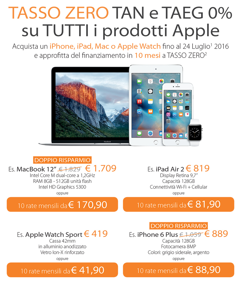 La promozione Tasso Zero Juice, con TAN e TAEG pari a zero, permette di suddividere il costo di un nuovo iPhone, iPad, Mac e anche Apple Watch in 10 piccole rate più abbordabili, senza costi aggiuntivi per il cliente. Tra le promozioni più interessanti segnaliamo lo sconto di 120 euro su MacBook 12” proposto da Juice a 1.709 euro invece di 1.829 euro, mentre il risparmio è doppio per iPhone 6 Plus da 128 GB proposto a 889 euro invece di 1.059 euro: questi due sconti per dispositivi fine serie possono essere abbinati anche al Tasso Zero Juice pagando MacBook 12 solo 170,90 euro al mese per 10 mesi e 10 rate da 88,90 euro per iPhone 6 Plus 128GB.