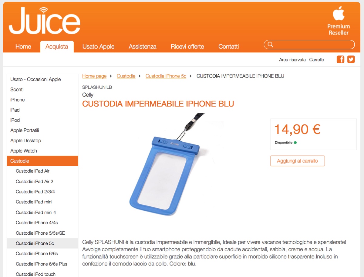 Ancora Apple Watch Sport da 419 euro si compra in 10 rate da 41,90 euro, mentre iPad Air 2 da 819 euro si paga in 10 rate da 81,90 euro. Per tutti coloro che desiderano utilizzare iPhone, iPad e Mac anche al mare, in piscina e durante le vacanze nei negozi Juice è disponibile un assortimento di accessori che permette di sfruttarli al massimo senza correre alcun rischio. Tra questi la custodia impermeabile Celly Splash Uni da 14,90 euro per iPhone e gli speaker impermeabili Polk Swimmer Junior e Swimmer Duo che offrono riproduzione audio di qualità anche in bicicletta, sotto la pioggia, in spiaggia o a bordo piscina, proposti rispettivamente a 49,90 euro e 69,90 euro nei colori blu e nero.