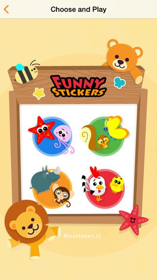 All’interno dei libri sono nascosti due giochi per imparare l’alfabeto: uno in italiano e uno in inglese. I bambini faranno scorrere le immagini sotto alle quali compare la lettera corrispondente e potranno facilmente andare avanti, tornare indietro e rivedere le immagini preferite, proprio come con le più classiche flash card. Facendo tap sul baule dei giochi saranno catapultati invece nel mondo degli stickers: potranno scegliere, per ora, tra quattro scenari diversi su cui divertirsi con tanti adesivi animati da spostare e rispostare (il fondo dell’oceano, la fattoria degli animali, il bosco, la savana).