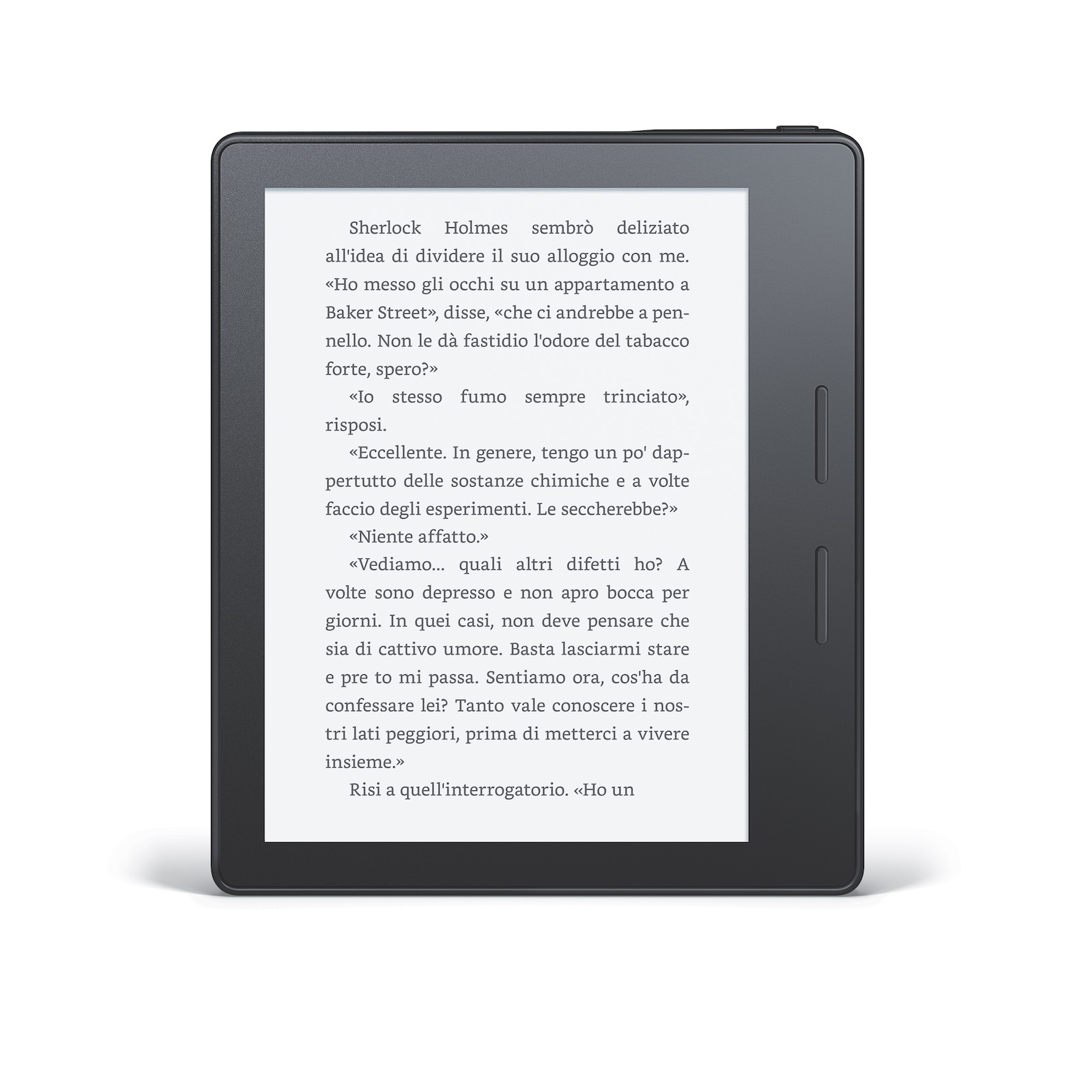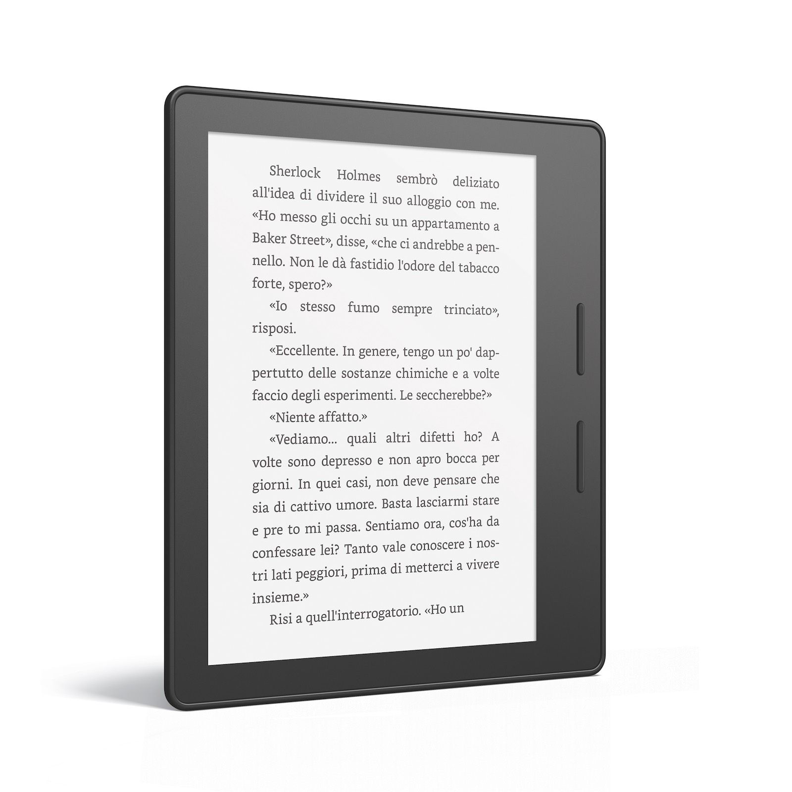 Il nuovo Kindle Oasis è progettato per offrire all’utente la sensazione di assenza di peso. Più sottile e leggero di ogni altro Kindle è costruito con soluzioni all’avanguardia per chassis, schermo e scheda madre. L’impugnatura ergonomica concentra il peso di soli 131 grammi nella mano dell’utente offrendo la stessa sensazione di impugnare un libro, grazie allo spessore maggiore da un lato e di soli 3,4 mm nel punto più sottile.