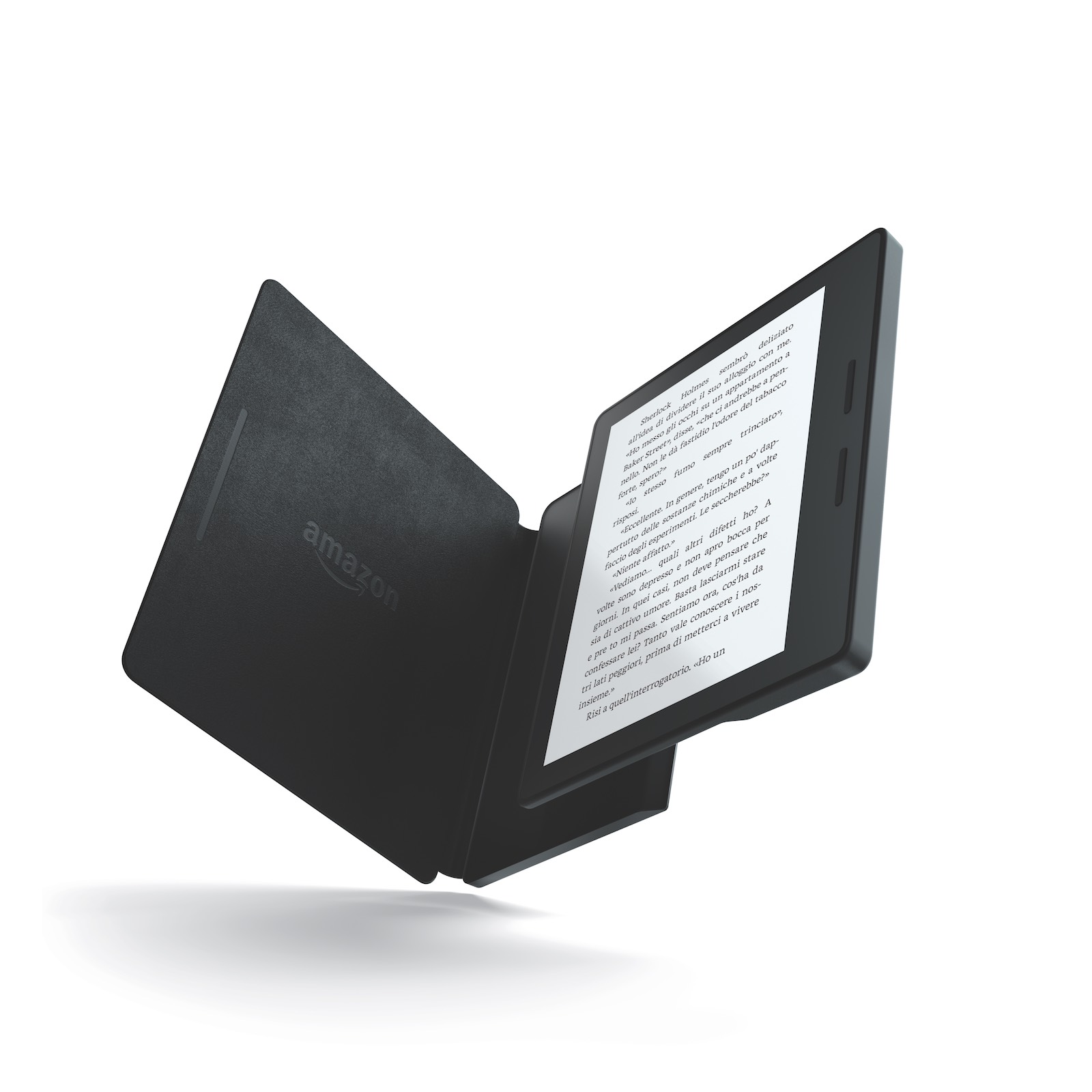 Il nuovo Kindle Oasis include la cover speciale ad hoc con batteria integrata: basta collegarla all’ebook reader per ricaricare la batteria di Kindle Oasis e disporre cos’ di mesi di autonomia. Il costruttore non dichiara precisamente l’autonomia stimata ma, secondo le anticipazioni delle scorse ore sembra possa arrivare addirittura a 20 mesi. La cover si connette a Kindle Oasis tramite 12 magneti integrati: è possibile ricaricare sia Kindle Oasis che la cover con un unico cavo. Lo speciale form factor di questo nuovo Kindle è progettato sia per utenti mancini che destrosi: l’accelerometro rileva l’impugnatura e ruota lo schermo di conseguenza, modificando anche le funzioni dei due tasti principali per voltare pagina avanti e indietro.