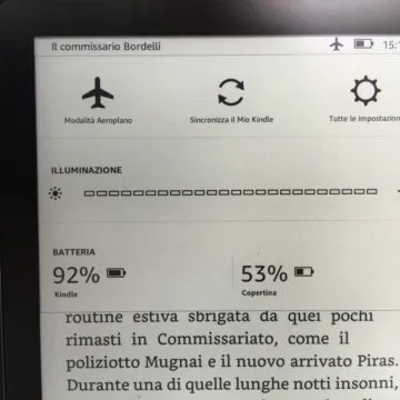 Invece il terzo menu da sinistra (indicato con una ruota dentata da ingranaggio) è quello per entrare nella modalità grafica delle impostazioni. Qui cambia a seconda che ci sia la cover attaccata oppure no: grandi icone permettono di passare rapidamente alla modalità aeroplano, sincronizzare con Kindle nel cloud (vedremo più avanti) e accedere a tutte le impostazioni. Inoltre si può regolare la luminosità e, se la cover è attaccata, viene visualizzato anche una ulteriore striscia con il livello della batteria interna ed esterna (“Kindle” e “Copertina”, come le chiama il sistema), che funzionano in modo interessante.