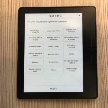 CI sono piccole variazioni di tipologia di interfaccia tra Kindle e Kindle perché le modalità di funzionamento e la capacità dei processori cambiano e sono diverse tra i vari modelli. Concentriamoci su quella per Oasis. È possibile rispondere a una serie di domande di profilazione sulla base dei propri gusti di lettura (quali generi, quali autori, quali tipologie etc) e il sistema operativo in basso presenta una striscia di libri “Raccomandati per te” che si aggiorna anche sulla base degli acquisti che vengono via via fatti. È una modalità tutt’altro che intrusiva e presenta cose piuttosto interessanti. Chi scrive non ha attivato Kindle Unlimited e quindi non ha in realtà accessso a una parte significativa della modalità di consumo dei libri da parte di Amazon. Tuttavia si può assicurare che anche senza Unlimited le proposte sono molto interessanti e ben calibrate, se si fa una cernita adeguata in fase di compilazione del questionario.