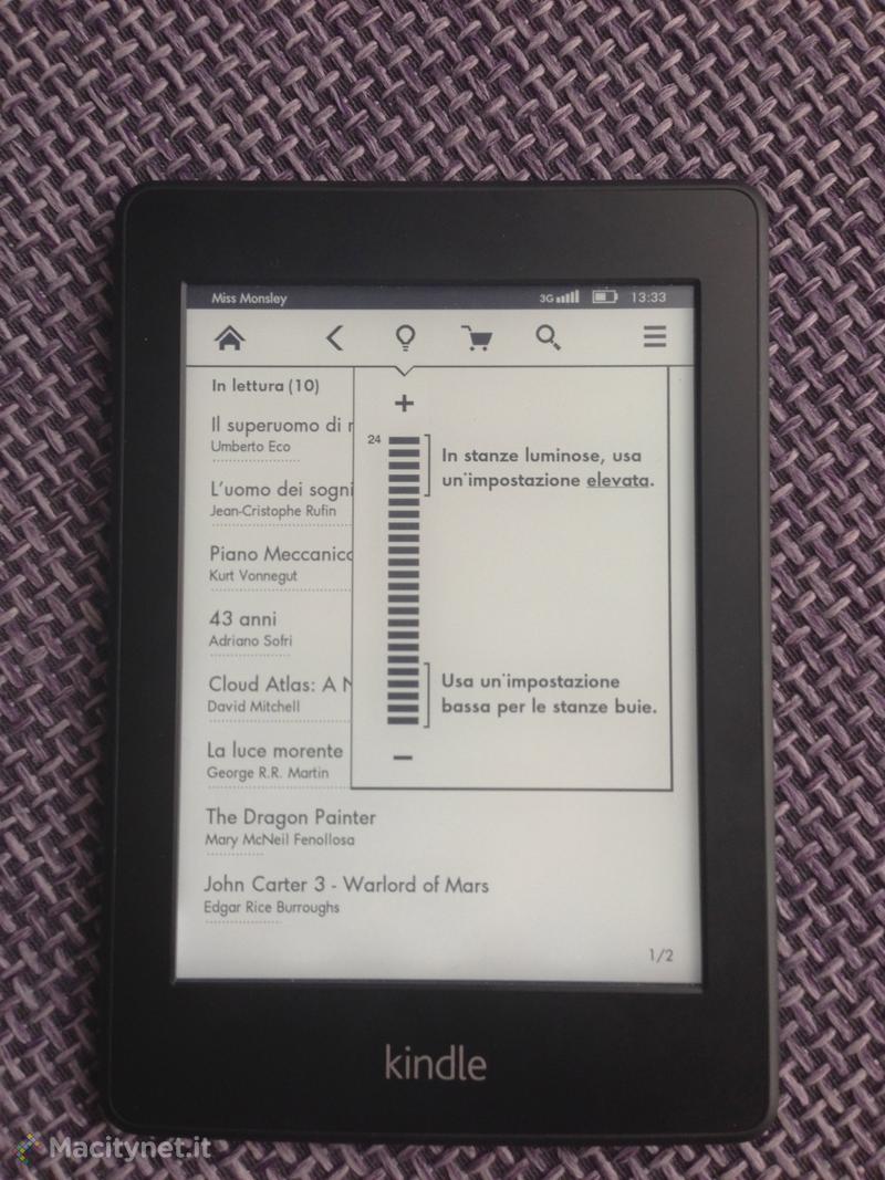 La nuova versione dell’interfaccia del Kindle Paperwhite è leggermente diversa dalle precedenti per i modelli touch, in quanto deve integrare anche i comandi per la luminosità: una semplice icona di lampadina che, una volta toccata, fa scendere un pratico menu graduato che corre per l’intera lunghezza del Paperlight. Scorrendo il dito, o usando i comodi comandi “+” e “-“, si può regolare la luminosità lungo una scala di 28 gradi più un grado zero (luminosità disattivata).