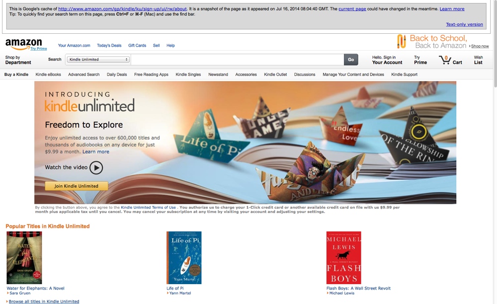 Con il nuovo servizio Kindle Unlimited di Amazon basterà sottoscrivere un abbonamento mensile dal prezzo abbordabile per poter accedere a una quantità illimitata di ebook e anche di audio libri. I dettagli su Kindle Unlimited non sono stati annunciati dal colosso dell’e-commerce ma sono trapelati su Internet grazie a una immagine cache rilevata da GigaOM, che riportiamo in calce in questo articolo. Nella testata dedicata al servizio in abbonamento per ebook capeggia il nome KindleUnlimited, seguito dallo strillo “Libertà di esplorare”.