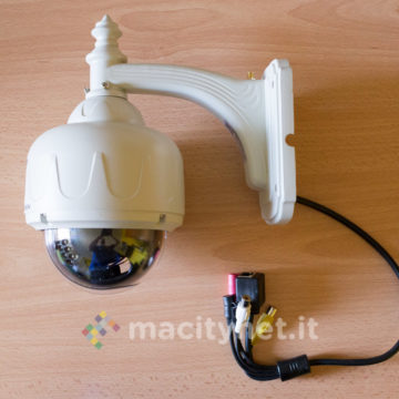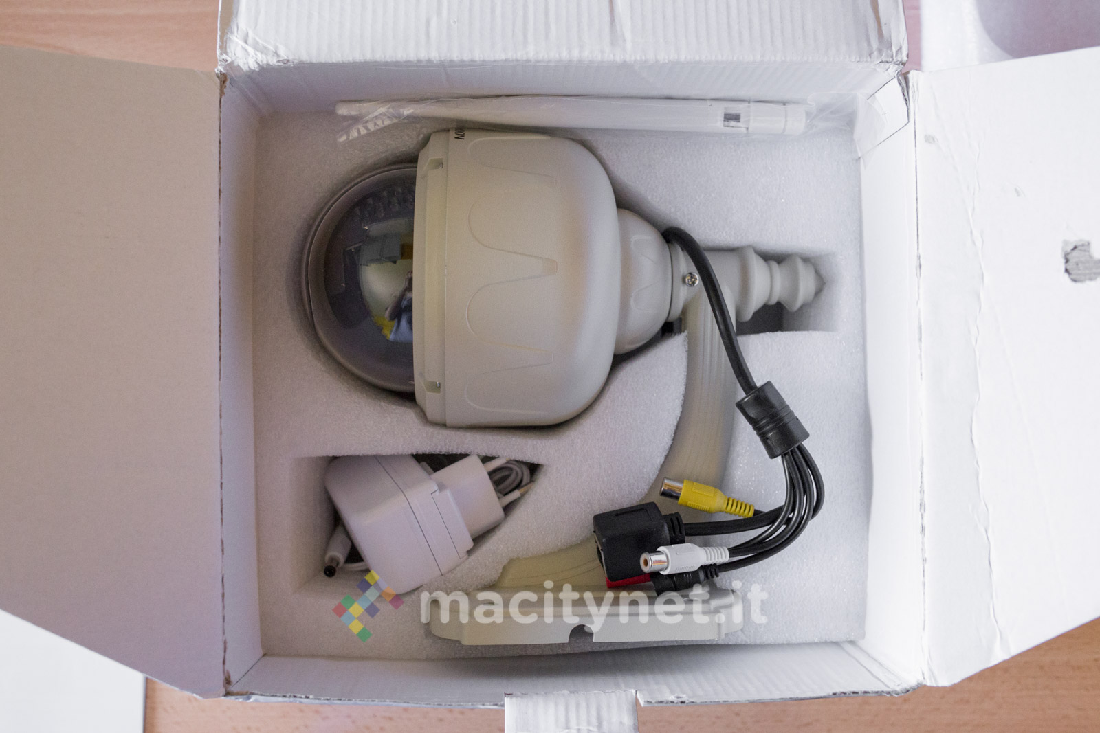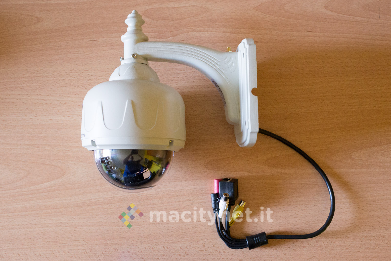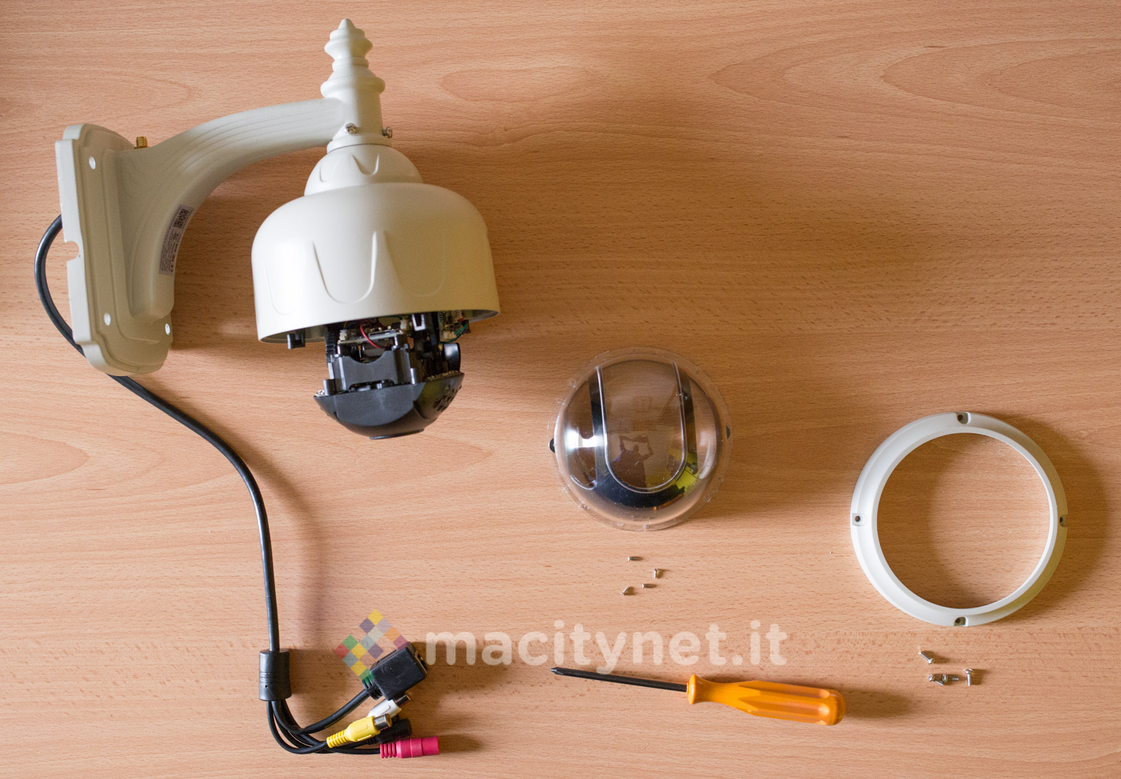 La videocamera è decisamente appariscente : il solo “bulbo oculare”, ovvero la metà sferica trasparente all’interno della quale si muove il gruppo ottico ha un diametro di circa 12 centimetri e tutta la struttura lascia sporgere la videocamera dal muro sulla quale andrà fissata di ben 22 centimetri.