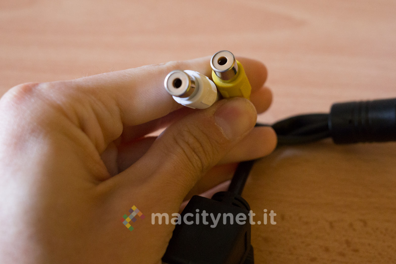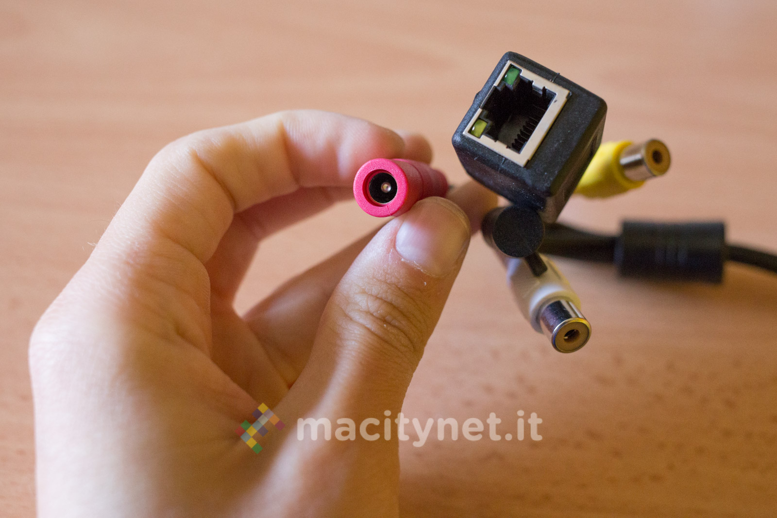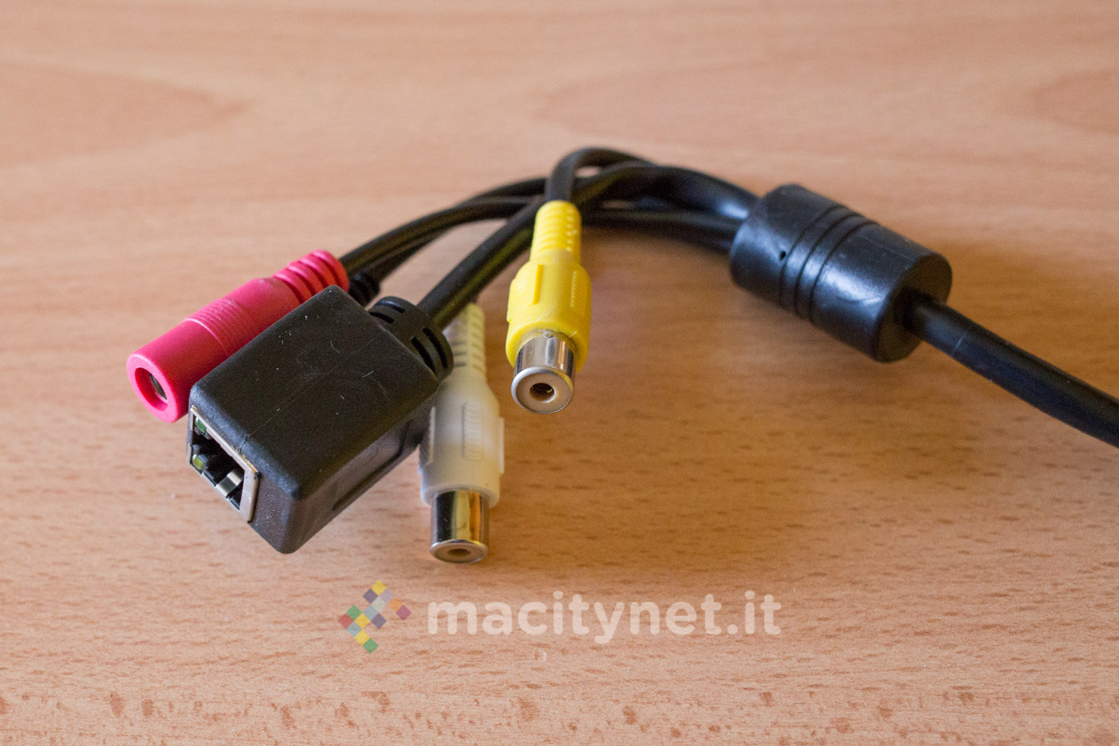 Complessivamente pesa poco più di un chilogrammo ma non è una caratteristica che dovrebbe interessare visto che andrà fissata al muro con quattro tasselli (inclusi in confezione), sebbene rimane difficile non notarlo quando la si estrae dalla scatola. Dal retro spunta uno spesso cavo al termine del quale si ramificano cinque cavetti : la presa Ethernet per il collegamento alla rete con filo, le uscite video (bianca e gialla), la presa per l’alimentazione (rossa) e un pulsante per il reset manuale della telecamera ben protetto dai click accidentali con un tappo (nero).