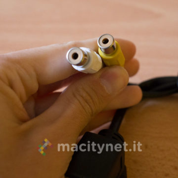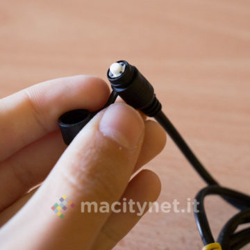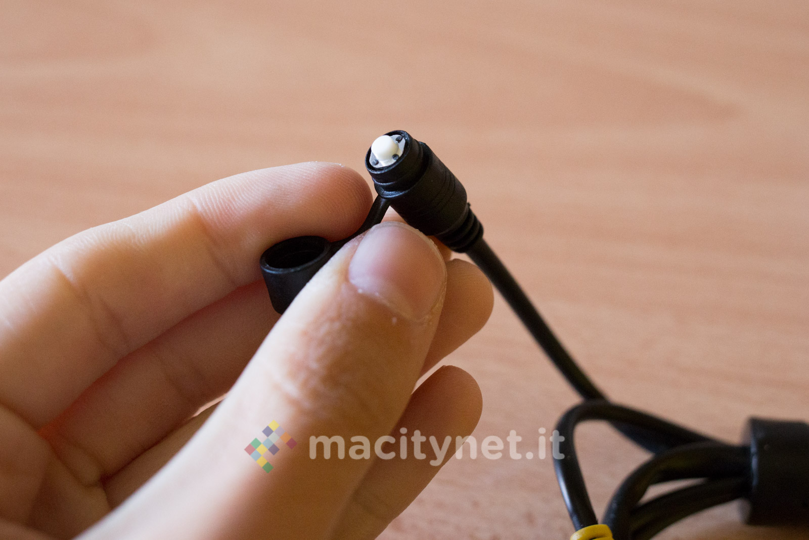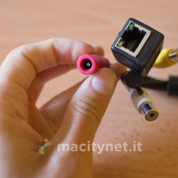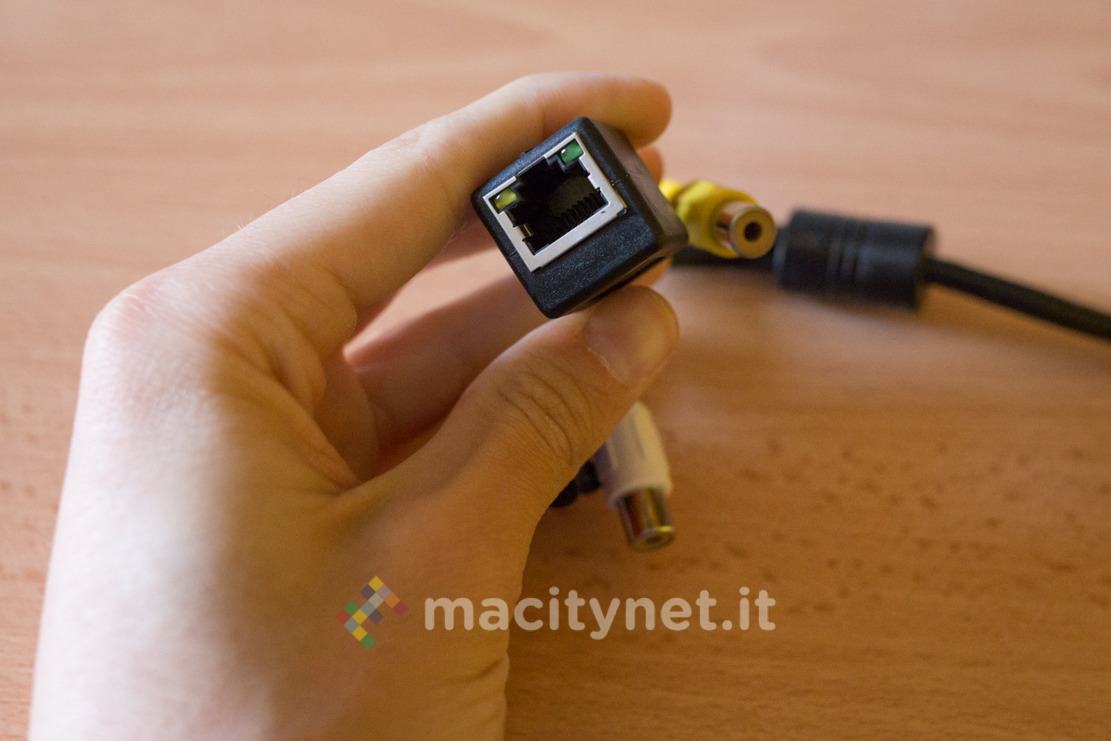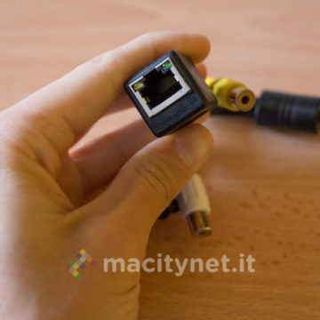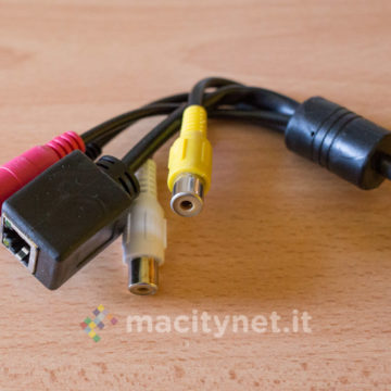 Complessivamente pesa poco più di un chilogrammo ma non è una caratteristica che dovrebbe interessare visto che andrà fissata al muro con quattro tasselli (inclusi in confezione), sebbene rimane difficile non notarlo quando la si estrae dalla scatola. Dal retro spunta uno spesso cavo al termine del quale si ramificano cinque cavetti : la presa Ethernet per il collegamento alla rete con filo, le uscite video (bianca e gialla), la presa per l’alimentazione (rossa) e un pulsante per il reset manuale della telecamera ben protetto dai click accidentali con un tappo (nero).