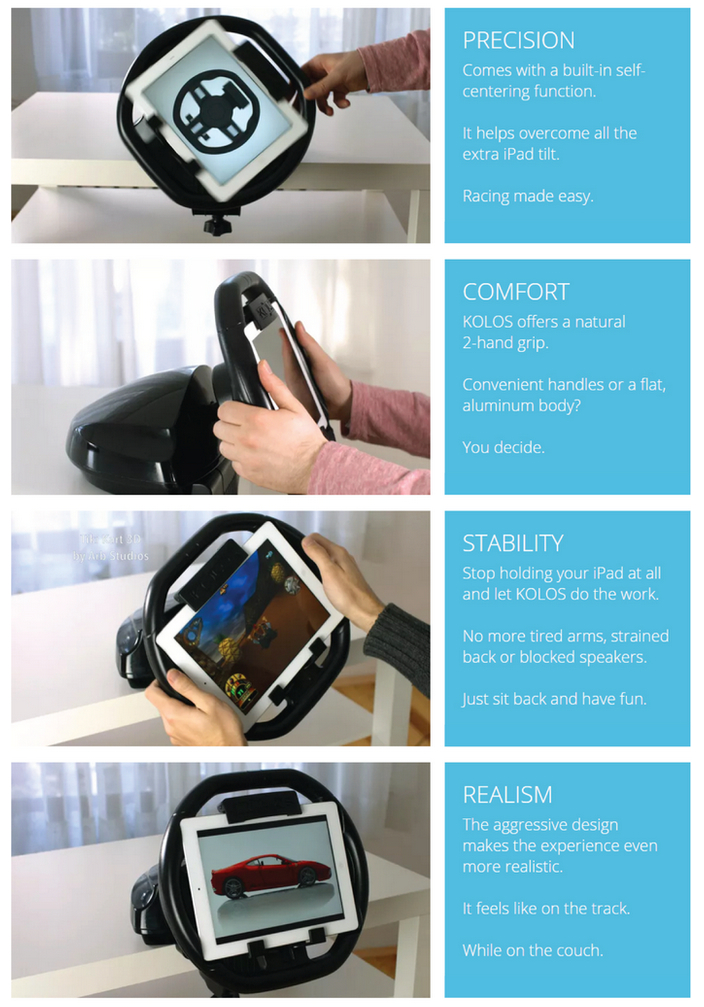 KOLOS (già visto al CES quando debuttò, ma senza alcuna indicazione precisa sull’effettivo arrivo commerciale) è il primo volante sopratavolo sviluppato appositamente per iPad: l’accessorio sfrutta iPad e i suoi sensori per agevolare l’esperienza di gaming con più di 100 fra i migliori giochi di guida, fornendo un’esperienza più comoda, precisa e realistica. I giocatori non dovranno mai più preoccuparsi della presa piatta, dell’inclinazione in aria o di avere le braccia stanche. Grazie al supporto da tavolo, il KOLOS potrà essere montato praticamente su tutti i tavoli diffusi ed è compatibile con tutte le generazioni di iPad a partire da iPad 2 (ma non con iPad mini).