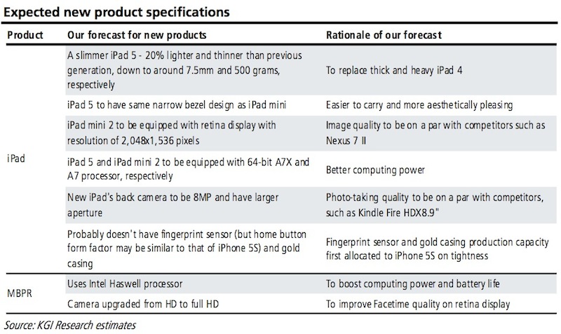 Secondo le informazioni di Kuo, il nuovo iPad mini 2 sfrutterà lo stesso processore A7 dell’ultimo iPhone 5s, mentre il display Retina da 2048 x 1536 ne farà incrementare leggermente il peso al nuovo iPad mini 2. L’iPad 5 invece avrà un peso di 500 grammi, più leggero rispetto al suo predecessore, avrà uno spessore di 7,5 millimetri, più sottile di iPad 4. La fotocamera sul retro del tablet sarà da 8 Megapixel con una maggiore apertura rispetto al passato, per garantire foto migliori in condizioni di scarsa illuminazione, sebbene non sia chiaro se si tratterà dello stesso modulo fotografico di iPhone 5s.